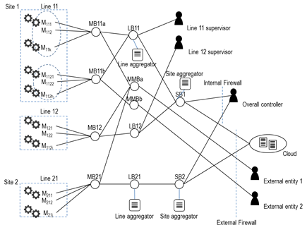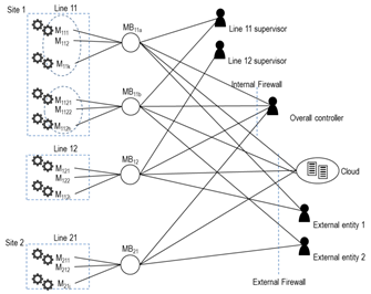 In this project, we considered an Industrial scenario where different production lines on different sites may be connected to the IT infrastructure and to possibly third parties that provide remote services. Each production facility may house several production lines consisting of diverse machinery, as depicted in Figure 2.