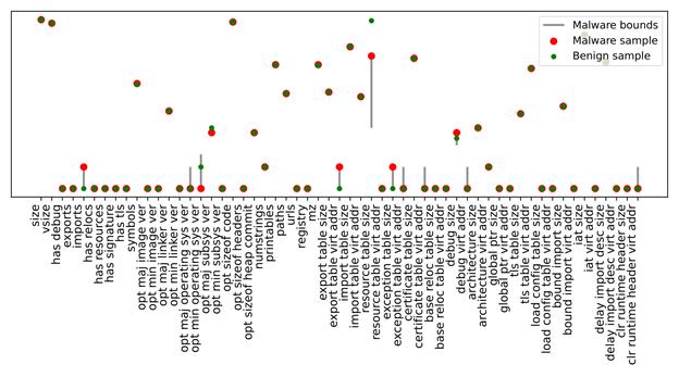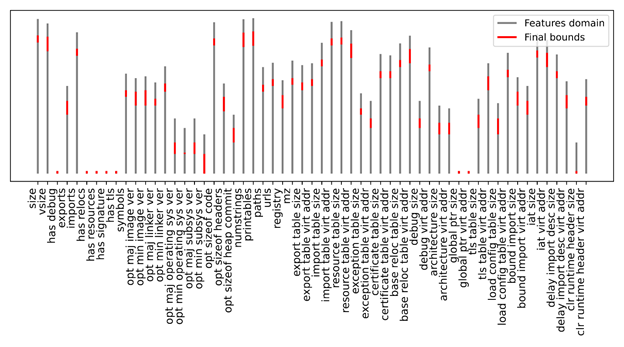 In the provided example, the feature domains are similar for both classifications (malware and benign files), with the exception of a single feature. This distinction allows for the identification of a region within the feature space that influences the model’s classification. From this, we can determine the minimal modification required to alter the model’s behavior and identify the most critical features driving the classification decision.